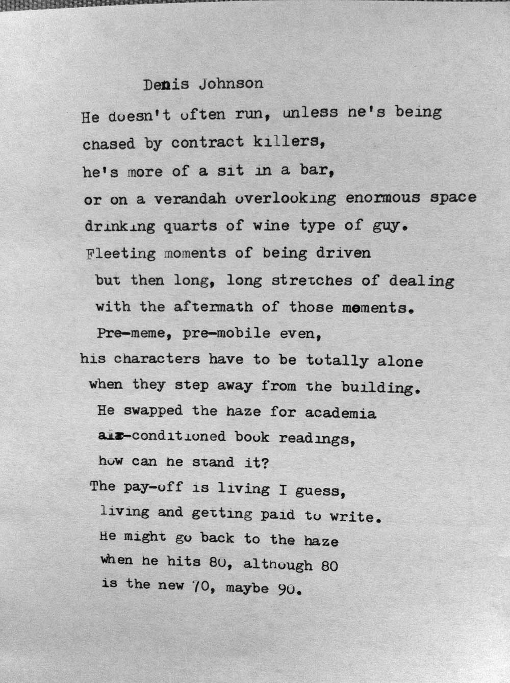 Denis JohnsonGiant TreesCreativeEnglishmanBumpEyesRecipePeregrine FalconQueenieSeeingHow To WriteJesus80pCigarette DaydreamsVolcanoesLife HistoriesFake TanCherriesNighthawksParrotToenailsWolvesThe Green ManConvent ConcussionHollowWorst Love PoemGibraltarTerminatorLensGeckoInspiration For Figurative ArtistGrim Up NorthEscapeJungleCats or the Amazon